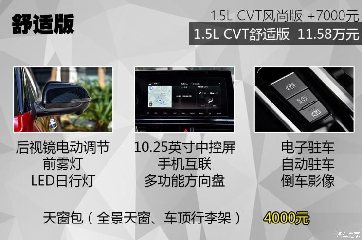 舒適版相比風(fēng)尚版貴了7000元,補(bǔ)充了不少的舒適性配置,10.25英寸的中控屏幕、多功能方向盤(pán)、電動(dòng)調(diào)節(jié)后視鏡,日常使用已經(jīng)可以滿(mǎn)足。在駕駛層面,電子手剎、自動(dòng)駐車(chē)、倒車(chē)影像這些輔助功能也都有覆蓋。如果是以夠用為標(biāo)準(zhǔn)的話,舒適版絕對(duì)是最合適的選擇。想要全景天窗和車(chē)頂行李架的話,官方還提供了選裝包,價(jià)格是4000元,不過(guò)個(gè)人認(rèn)為如果喜歡全景天窗和行李架,還是看看潮流版,性?xún)r(jià)比會(huì)比單獨(dú)加選裝包更高一些。