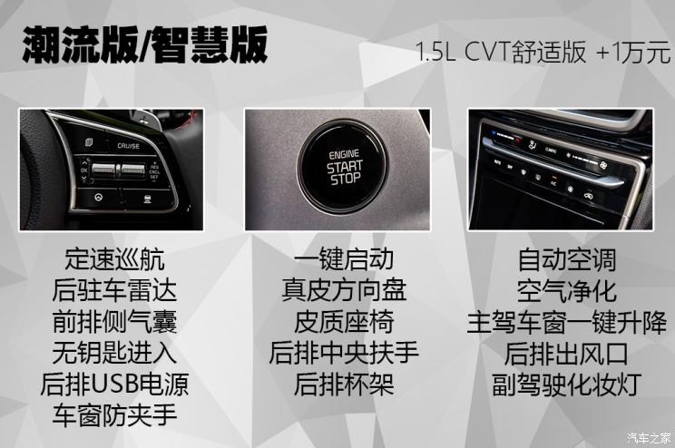 潮流版和智慧版的價(jià)格相同,都是在舒適版的基礎(chǔ)上增加了1萬(wàn)元,但是增加的配置有一些區(qū)別,下面咱們來(lái)看看這兩款車(chē)相比舒適版增加了哪些配置,先看兩車(chē)相同的配置。