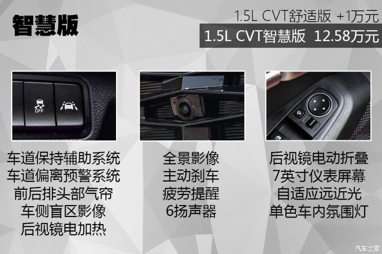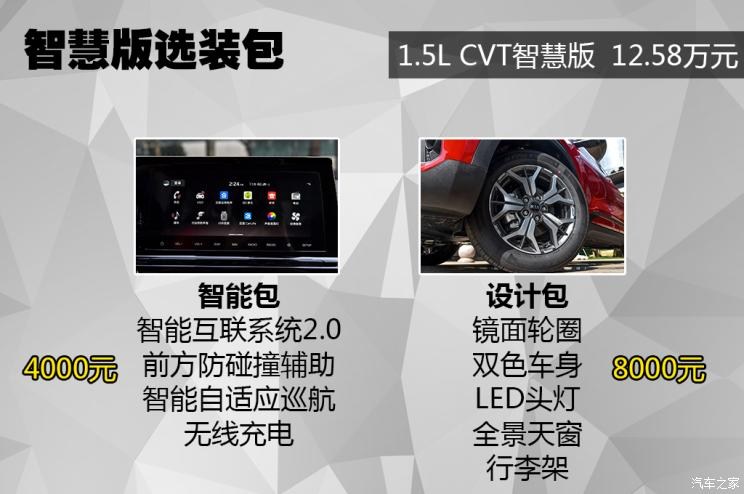 除了標(biāo)準(zhǔn)配置之外,智慧版還提供兩個(gè)選裝包,分別是智能包和設(shè)計(jì)包。智能包的價(jià)格是4000元,包含智能互聯(lián)系統(tǒng)2.0、前方防碰撞輔助、全速域自適應(yīng)巡航系統(tǒng)和車(chē)內(nèi)無(wú)線充電功能。智能互聯(lián)系統(tǒng)2.0在車(chē)機(jī)系統(tǒng)中加入了語(yǔ)音交互、百度導(dǎo)航、QQ音樂(lè)等功能。另外一個(gè)是設(shè)計(jì)包,價(jià)格8000元,包含17英寸鏡面輪圈、雙色車(chē)身、LED頭燈、全景天窗和行李架,也就是潮流版單獨(dú)增加的外觀套裝。不過(guò)根據(jù)經(jīng)銷(xiāo)商反饋,選裝的等車(chē)時(shí)間大約在兩個(gè)月左右。