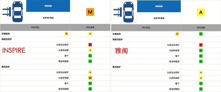 其次在側面碰撞測試中,INSPIRE的車頂隆起情況要比雅閣情況更糟,使得兩車在主副駕駛頭部運動保護以及頭部和頸部保護上均獲得不同評級。其中,INSPIRE為一個P(較差)、兩個A(良好)及一個M(一般),而雅閣則獲得一個P(較差)、兩個A(良好)及一個G(優(yōu)秀),所以整體評級上雅閣為G(優(yōu)秀), INSPIRE為M(一般)。