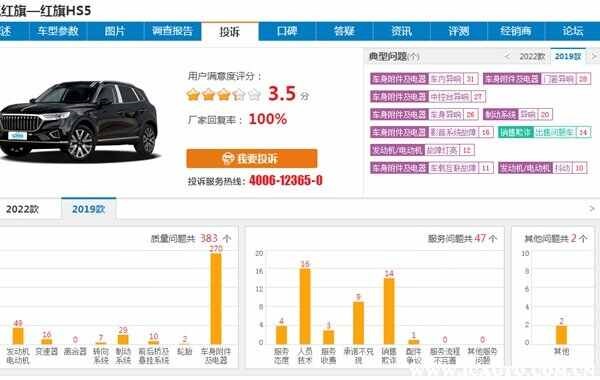 關(guān)于這個(gè)口碑和質(zhì)量問(wèn)題,我們可以通過(guò)車質(zhì)網(wǎng)相關(guān)數(shù)據(jù)一探究竟。紅旗HS5從2019年開(kāi)始上市銷售,我們先看看2019款紅旗HS5投訴情況。記錄質(zhì)量問(wèn)題共383個(gè),主要集中在車身附件及電器、發(fā)動(dòng)機(jī)電動(dòng)機(jī)、制動(dòng)系統(tǒng)等方面。