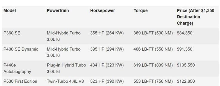 動力方面,新車推出了汽油、柴油以及插混三種版本,汽油版擁有三種版本,其中P400與P360將搭載分為高/低功率的3.0T渦輪增壓直列六缸發(fā)動機(jī),并加入了48V輕混系統(tǒng),P530車型則是搭載一個4.4T雙渦輪增壓V8發(fā)動機(jī)?;靹影娣譃镻510e與P440e兩種版本,分別搭載了高/低功率的3.0T渦輪增壓直列六缸發(fā)動機(jī),并加入了電機(jī)組成插混系統(tǒng),所有車型均匹配8速自動變速箱以及智能四驅(qū)系統(tǒng)。