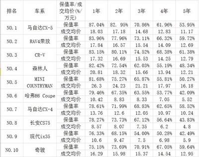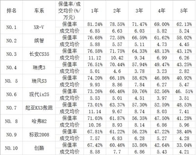 在小型SUV里面,保值率前十名的車型分別是XR-V繽智、長安CS35、瑞虎3、瑞風(fēng)S3、現(xiàn)代ix25、起亞KX3傲跑、哈弗H2、標(biāo)致2008、以及創(chuàng)酷。