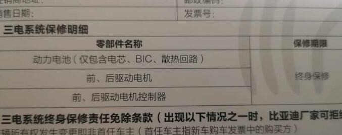 比亞迪電池衰減更換標準目前比較普遍的說法是質(zhì)保期內(nèi)衰減超過30%,根據(jù)比亞迪隨車配發(fā)的《比亞迪汽車三包憑證及保養(yǎng)服務(wù)手冊》,動力電池(僅包含電芯、BIC、散熱回路)、前后驅(qū)動電機、前后驅(qū)動電機控制器的保修期限都是終身保修。