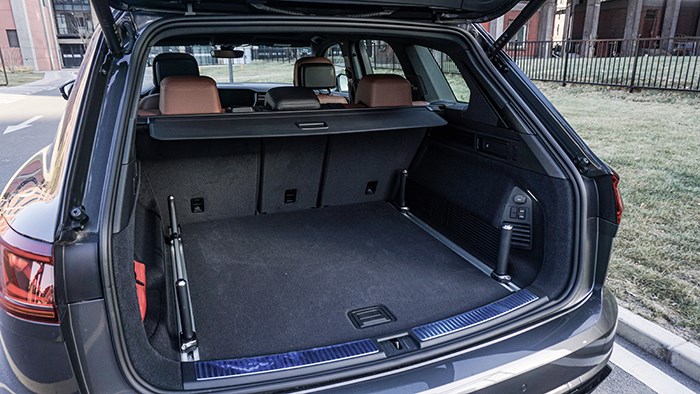 后備廂空間方面,這一代途銳擁有810L的后備廂容積。后排座位支持一鍵放倒,放倒后,后備廂的進(jìn)深可由1020mm增加到1910mm,空間拓展非常簡(jiǎn)單。后備箱右側(cè)帶有車尾升降開(kāi)關(guān),方便裝卸大件物品。