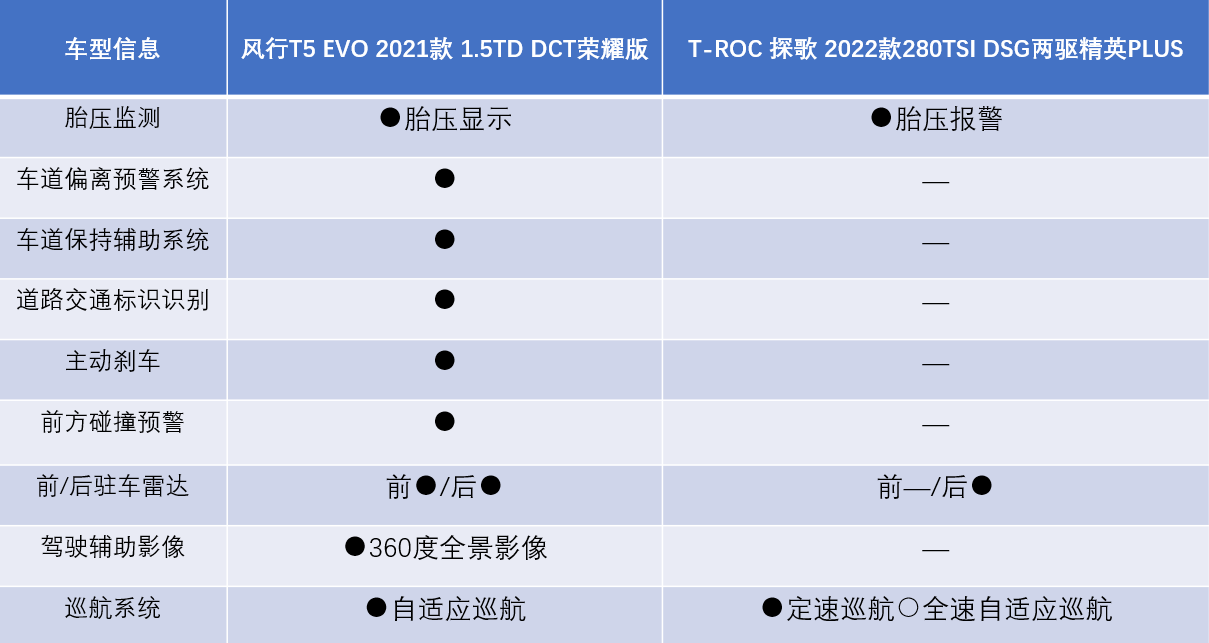 今天我們就選擇同一級(jí)別的SUV車型風(fēng)行T5 EVO 2021款1.5TD DCT榮耀版與T-ROC探歌2022款280TSI DSG兩驅(qū)精英PLUS(以下簡(jiǎn)稱風(fēng)行T5 EVO與探歌)做個(gè)對(duì)比,看看這兩款車在安全性能上誰(shuí)更出色?