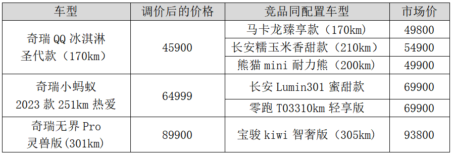 2023年3月27日0點(diǎn)起,奇瑞新能源旗下奇瑞QQ冰淇淋、奇瑞小螞蟻和奇瑞無(wú)界Pro三款產(chǎn)品官方指導(dǎo)價(jià)正式回調(diào),至高回調(diào)幅度9000元。當(dāng)汽車行業(yè)最殘酷的價(jià)格戰(zhàn)打響,限時(shí)降價(jià)、保價(jià)等奇招盡出時(shí),奇瑞新能源將格局直接拉滿,成為純電小車首家官降。