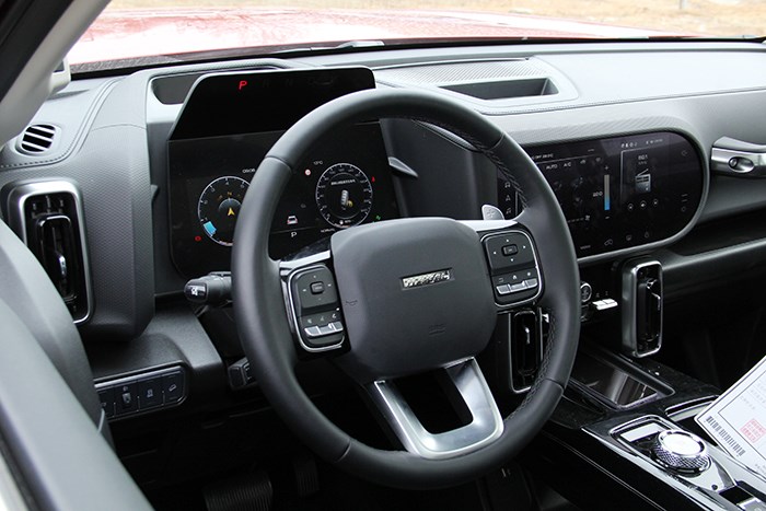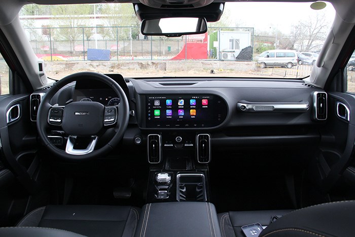 中控區(qū)域采用一塊12.3英寸大屏,在顯示色彩和細(xì)膩度方面表現(xiàn)不錯(cuò),所含內(nèi)容也十分豐富,日常駕駛與使用的功能基本上都能涵蓋上。除了虛擬按鍵外,空調(diào)、行車影像與四驅(qū)設(shè)置了物理按鍵,以滿足不同消費(fèi)者的使用習(xí)慣。這里著重表揚(yáng)一下大狗的全景影像系統(tǒng),畫面設(shè)計(jì)符合大多數(shù)人的使用習(xí)慣,并且車型以線條展示,可以讓操作者更易判斷實(shí)際道路情況。
