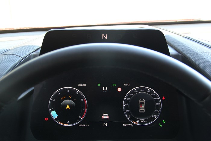 多功能儀表的設(shè)計(jì)比較有意思,分為上下兩塊,下方為液晶屏顯示,黑底白字易于讀取信息,中間的行車動(dòng)畫效果畫面細(xì)膩,借助于全景攝像頭,可實(shí)時(shí)監(jiān)控道路車輛情況,增強(qiáng)了行車安全性;上方則是單獨(dú)設(shè)計(jì)出來的檔位顯示,剛好處在方向盤與抬頭顯示之間。