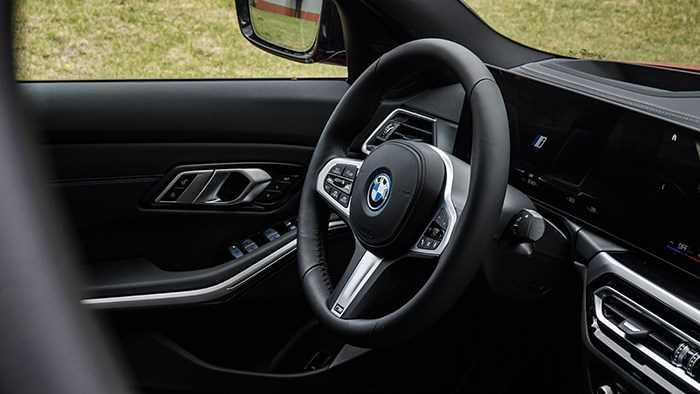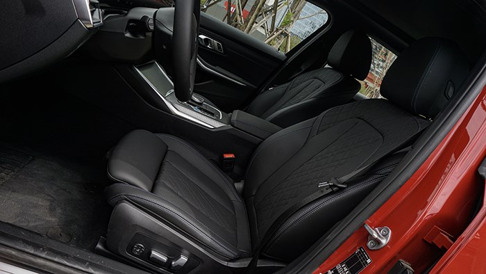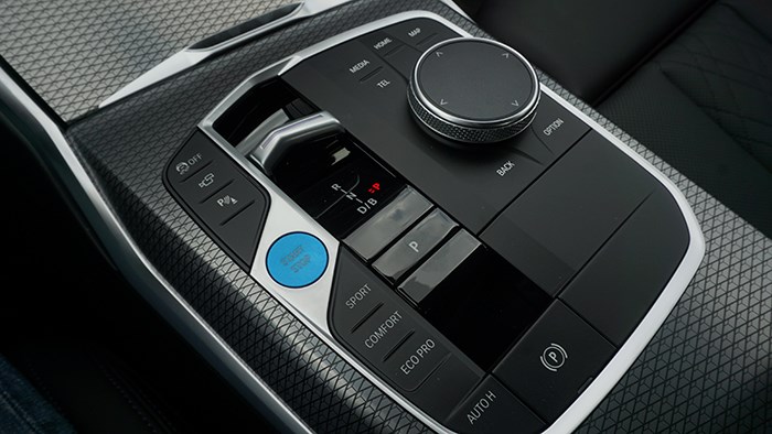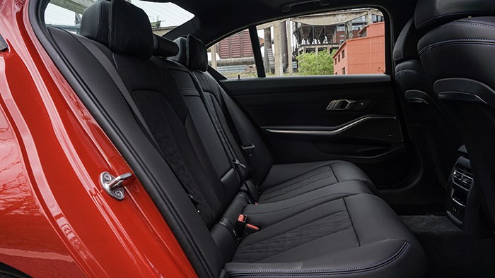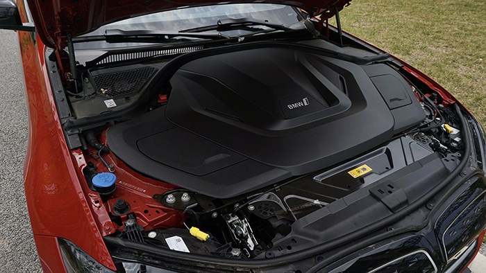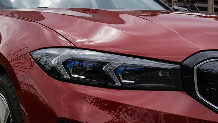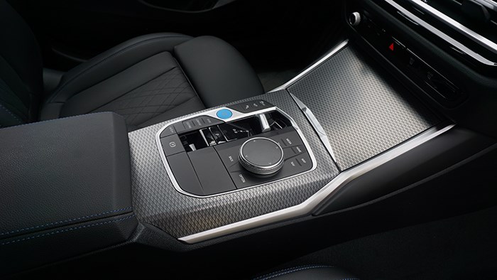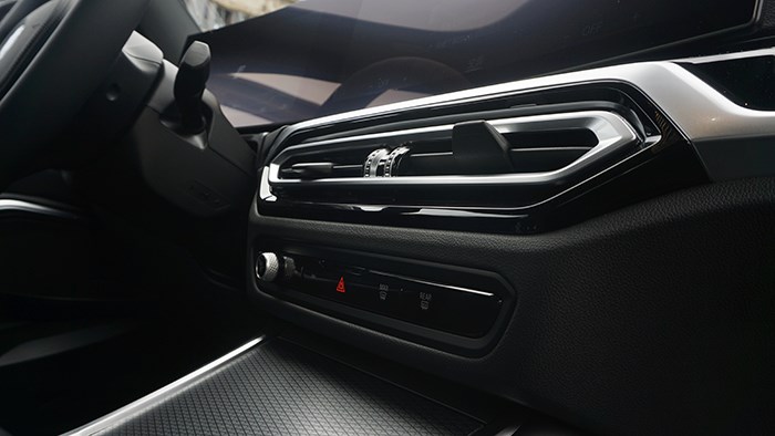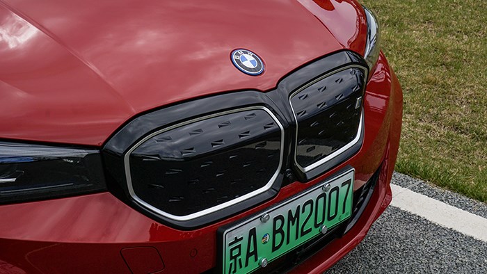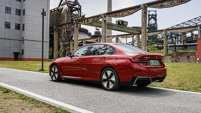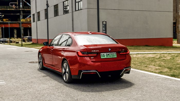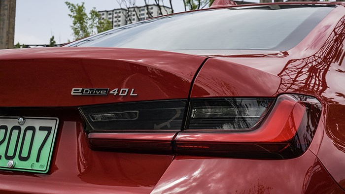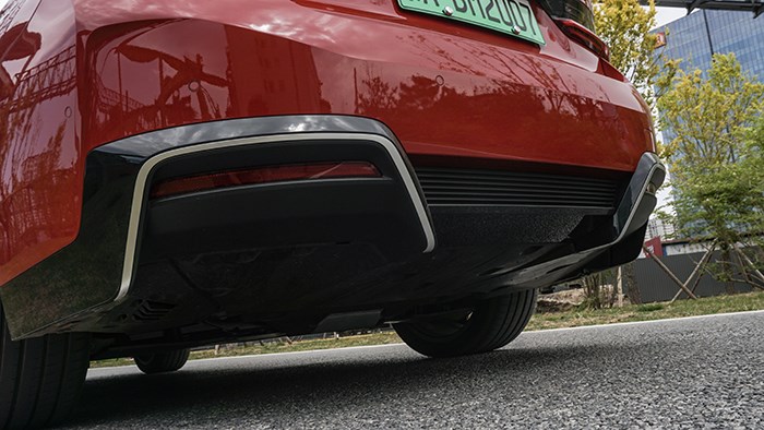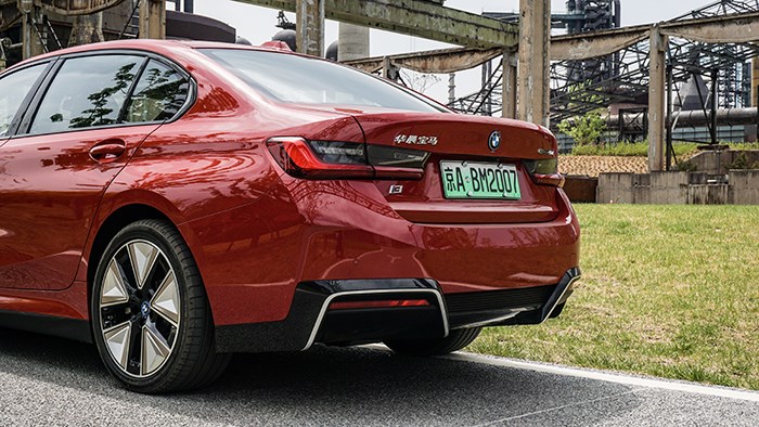 新車尾部最為顯眼的是這個大尺寸尾部擴散器,相比燃油版3系更夸張。