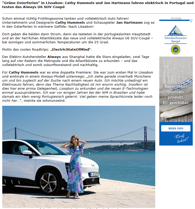 日前,愛馳旗下第二款量產(chǎn)車愛馳U6在葡萄牙首都里斯本舉辦的歐洲大型媒體試駕會上,共邀請了全球超160家權(quán)威媒體和各圈層KOL前來試駕。我們從德國媒體《ganz-muenchen》的報道中了解到,愛馳U6憑借綠色智能的純電實(shí)力和卓越的駕乘品質(zhì),成功收獲了德國知名KOL Cathy Hummels和德國著名演員Jan Hartmann的一致好評。