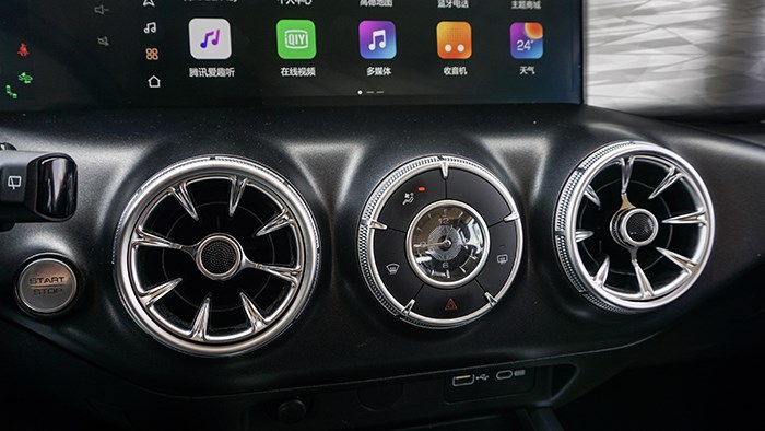 空調(diào)出風(fēng)口為漩渦的造型,兩側(cè)為真正的出風(fēng)口,中間則是集成了空調(diào)控制面板以及機(jī)械鐘表。在夜間新車氛圍燈的營(yíng)造氛圍感滿滿。