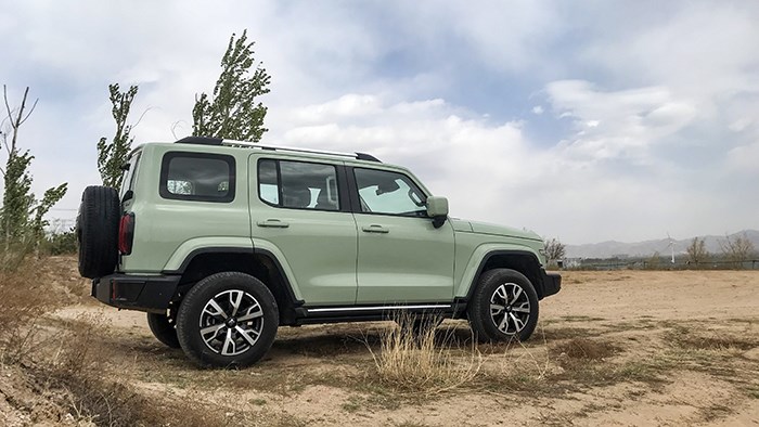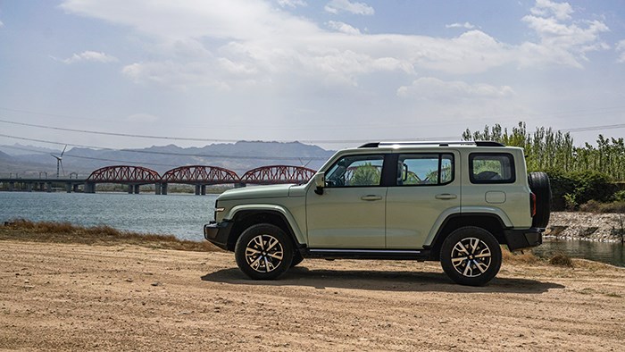 坦克300的側(cè)面輪廓四平八穩(wěn),擁有外突的大輪眉,并使用與車身同色的涂裝。車身上也沒(méi)有使用太多復(fù)雜的線條,觀感比較干練。