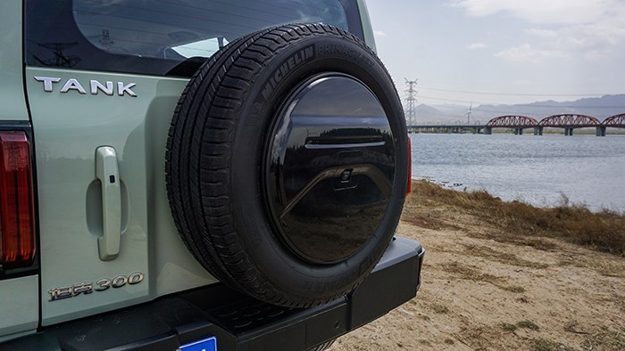 很多越野車都會(huì)選擇外露備胎的方式,不過(guò)坦克300還為備胎配備了輪胎保護(hù)罩,攝像頭巧妙的放在了中間部位。