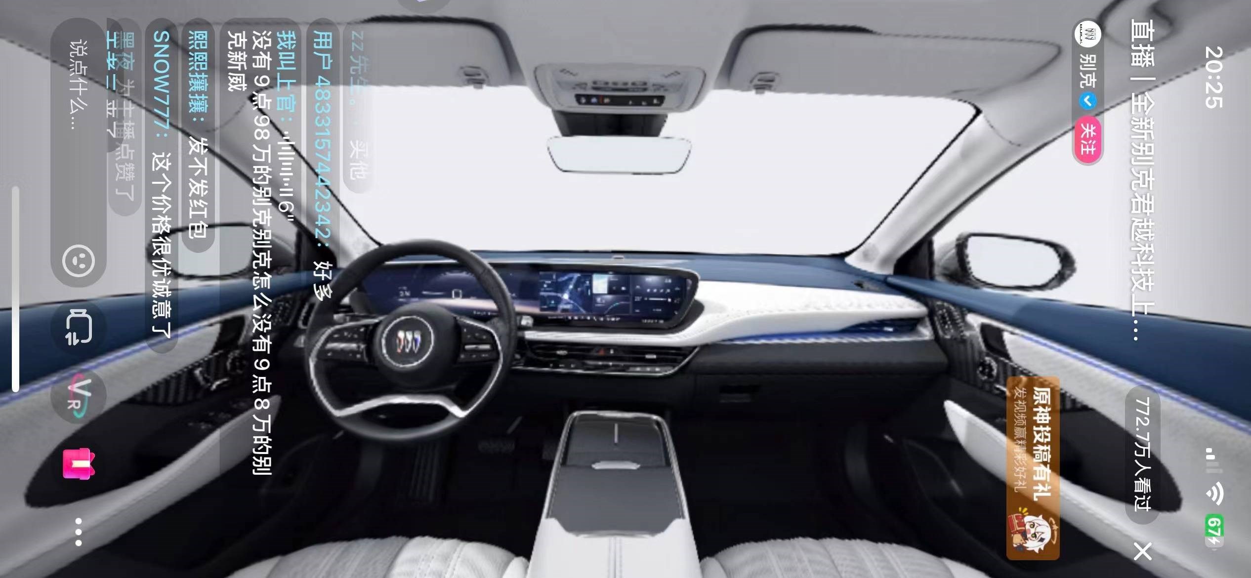 在PICO端,別克君越定制虛擬直播場,帶領(lǐng)車友解鎖前所未有的VR沉浸玩法,把新車直接“開到”眼前。端內(nèi)提供「現(xiàn)場發(fā)布會視角 新車車內(nèi)視角」雙VR機(jī)位,帶上一體機(jī),車友轉(zhuǎn)動頭部即可看到品牌專屬虛擬互動場,不在現(xiàn)場卻可以獲得“超現(xiàn)場級”的VVIP體驗(yàn):「現(xiàn)場發(fā)布會視角」采用“180°現(xiàn)場實(shí)拍 180°虛擬互動場 2D副屏”制作形式,疊加氣泡、光線、極光等5款既有特效和新車亮相定制特效,與全新別克君越的光塑美學(xué)設(shè)計(jì)語言交相輝映;「新車車內(nèi)視角」則進(jìn)行360°新車車內(nèi)實(shí)拍,看似不加修飾的畫面卻藏有巧思:只有“刪繁就簡”不疊加任何互動與特效,才能讓用戶以最清晰、高效的方式體驗(yàn)到最真實(shí)的新車,以“生圖”凸顯產(chǎn)品優(yōu)勢。