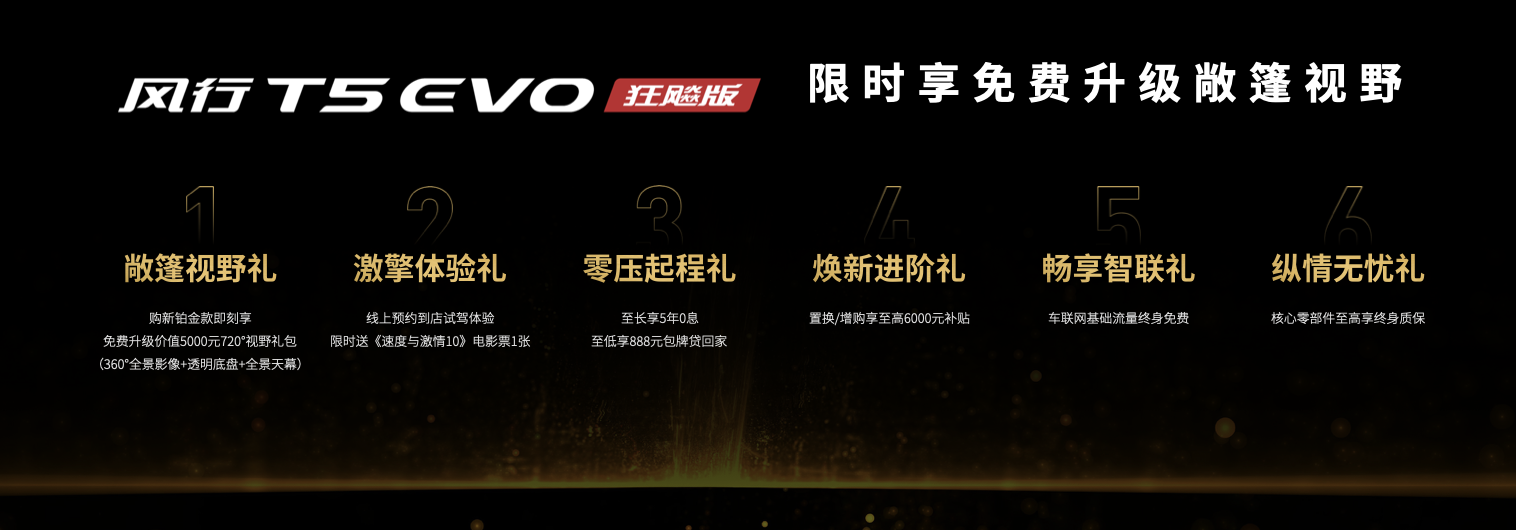 而且,在風(fēng)行T5 EVO狂飚版的發(fā)布會(huì)上,隨著新車一起亮相的還有關(guān)于風(fēng)行T5 EVO狂飚版的各種購(gòu)車優(yōu)惠政策——【敞篷視野禮】購(gòu)鉑金款即刻享免費(fèi)升級(jí)價(jià)值5000元720°視野禮包(360全景影像 透明底盤 全景天幕)、【零壓?jiǎn)⒊潭Y】首付3888元包牌貸回家,至長(zhǎng)享5年0息、【煥新進(jìn)階禮】至高置換補(bǔ)貼享6000元、【暢享智聯(lián)禮】享車聯(lián)網(wǎng)終身免基礎(chǔ)流量、【縱情無(wú)憂禮】首任車主享核心零部件終身質(zhì)保,更有【激擎體驗(yàn)禮】——限時(shí)送《速度與激情10》電影票,只要線上預(yù)約到店試駕體驗(yàn)即可領(lǐng)取,絕對(duì)是最純粹的福利。