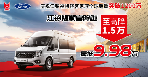 為慶祝江鈴福特輕客家族全球銷量突破1200萬(wàn)輛,即日起江鈴福順官方降價(jià)1.5萬(wàn)元。江鈴輕客不僅用更超值的價(jià)格,感恩千萬(wàn)用戶的厚愛,共享全球1200萬(wàn)車主榮耀,更進(jìn)一步滿足用戶對(duì)于江鈴輕客的旺盛需求,助力更多用戶賺錢致富。