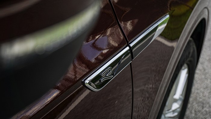 途銳的車身尺寸為4878*1984*1694mm,軸距2899mm。車身側(cè)面造型厚重飽滿,鋒利的腰線在貫穿車身,跟拱起的輪眉呼應(yīng),霸氣十足。這臺(tái)入門款的途銳使用了素色19英寸輪轂,搭配255/55 R19輪胎。翼子板上的R標(biāo)是全系標(biāo)配的裝飾件。