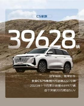 進(jìn)入 12 月,各大汽車廠商陸續(xù)公布了 11 月的最新銷量數(shù)據(jù) 。 其中 ,長安汽車 CS75 系列依舊不負(fù)眾望 。在“ 明日座駕 ”第三代 CS75PLUS 的強(qiáng)力賦能下, 11 月長安 CS75 系列交出了單月銷售 22278 輛的成績 。在連續(xù)八個月單月銷量突破 2 萬輛后,長安 CS75 系列以 1— 11 月累計銷售 230987 輛的市場表現(xiàn) ,繼續(xù)霸榜 2023年中國 SUV 燃油車銷量第一的位置 。