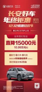 為助力更多用戶輕松開啟明日生活,長安汽車也限時推出“年終 鉅惠-12.12 感恩狂歡節(jié) ”活動 。12 月 1 日—31 日,消費者購買第 三代 CS75PLUS ,均有機(jī)會獲得全系現(xiàn)金直降 15000 元 、888 元享終身基礎(chǔ)保養(yǎng), 以及 0 首付 、0 月供 、0 利息等一系列驚喜好禮。