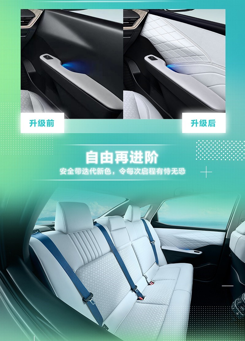 內(nèi)飾方面,新車采用全新液晶儀表以及大尺寸中控屏,并升級內(nèi)飾材質(zhì)。座椅增加菱形縫線及增加藍色安全帶。