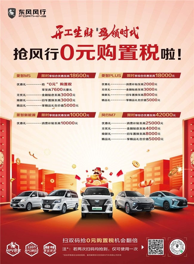 龍年新始,菱智家族為感恩回饋24年來一路支持陪伴的用戶,再次開啟“開工生財(cái),盈領(lǐng)時(shí)代”強(qiáng)勢寵粉活動,滿滿的誠意與以寵粉著稱的蔚來相比有過之而無不及。如購買菱智M5限時(shí)享綜合優(yōu)惠至高18600元,購買菱智PLUS限時(shí)享綜合優(yōu)惠至高18000元,購買菱智新能源限時(shí)享現(xiàn)金優(yōu)惠至高10000元,購買風(fēng)行M7限時(shí)享綜合優(yōu)惠至高42000元。