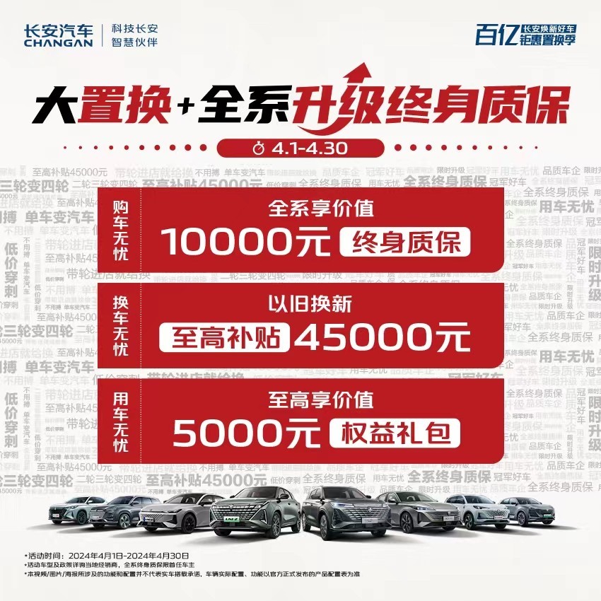 踐行“伙伴 ”用戶思維,百億鉅惠置換季中,用戶還可享受至高價值5000元權(quán)益禮包,實現(xiàn)用車無憂。此外,長安汽車還于4月1日官宣,截止4月30日,旗下全系車型升級享價值10000元終身質(zhì)保,讓用戶買的放心、用的安心。