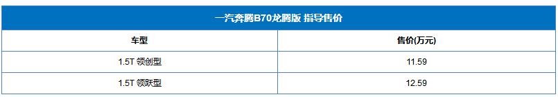 近日,一汽奔騰B70龍騰版正式上市,共推出2款車型,售價區(qū)間為11.59-12.59萬。