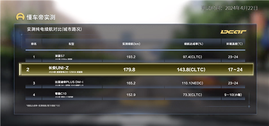 在純電續(xù)航測(cè)試環(huán)節(jié)中,懂車帝將路線設(shè)置在北京三環(huán)和四環(huán),全程平均車速控制在30-35公里/小時(shí)。經(jīng)懂車帝測(cè)試,長(zhǎng)安UNI-Z的純電續(xù)航里程達(dá)179.8公里,大幅超出其CLTC工況下標(biāo)稱的125公里,續(xù)航達(dá)成率達(dá)143.8%,而在WLTC工況下其續(xù)航達(dá)成率更是高達(dá)189%。如此大幅度的反向虛標(biāo),長(zhǎng)安UNI-Z堪稱汽車界的純電續(xù)航“虛標(biāo)王”。該成績(jī)不僅優(yōu)于一同測(cè)試的零跑C10、深藍(lán)S7和比亞迪宋PLUS DM-i,也較宋PRO DM-i實(shí)測(cè)的141.3公里純電續(xù)航有明顯優(yōu)勢(shì)。