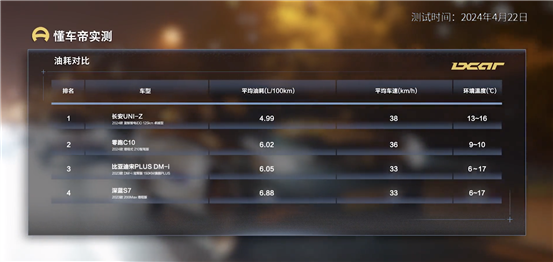 此次實(shí)測(cè)中,懂車帝也對(duì)長(zhǎng)安UNI-Z進(jìn)行了饋電油耗測(cè)試。測(cè)試結(jié)果顯示,長(zhǎng)安UNI-Z的饋電綜合油耗全場(chǎng)最低,為4.99升/百公里,一同測(cè)試的比亞迪宋PLUS DM-i、零跑C10和深藍(lán)S7均超過(guò)6升/百公里,和宋PRO DM-i實(shí)測(cè)的4.76升/百公里的測(cè)試成績(jī)相比也僅略微高出。從成本來(lái)看,懂車帝此次實(shí)測(cè)的4臺(tái)測(cè)試車均加注92號(hào)汽油,以測(cè)試當(dāng)天北京92號(hào)汽油8.25元/升的價(jià)格計(jì)算,長(zhǎng)安UNI-Z每公里燃油成本僅為0.41元,同樣為測(cè)試的四臺(tái)車中最低。