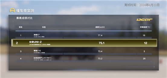 在百公里加速以及制動(dòng)環(huán)節(jié)中,長(zhǎng)安UNI-Z同樣拿出了優(yōu)異表現(xiàn),高電量狀態(tài)下百公里加速最佳時(shí)間為8.13秒,在百公里剎停項(xiàng)目中則取得了39.22米的最佳成績(jī)。兩項(xiàng)數(shù)據(jù)均優(yōu)于宋PRO DM-i和宋PLUS DM-i。