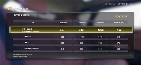 懂車帝也通過(guò)HPM標(biāo)準(zhǔn)測(cè)試假人對(duì)長(zhǎng)安UNI-Z的空間表現(xiàn)進(jìn)行了實(shí)測(cè)。測(cè)試顯示,長(zhǎng)安UNI-Z表現(xiàn)優(yōu)秀,第一排高度989mm,用戶最為關(guān)注的第二排腿部空間也達(dá)到了749mm,膝部空間接近兩拳。相較于其他競(jìng)品,長(zhǎng)安UNI-Z與宋PLUS DM-i的第二排腿部空間在此次測(cè)試中并列第一。