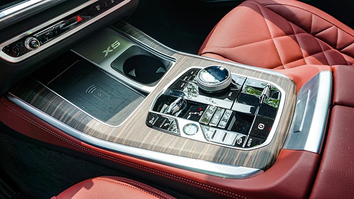 橫紋實(shí)木面板與鋼琴漆漆面、啞光色鋁條營造出充滿豪華感的控制區(qū)。手機(jī)無限充電、X5精致徽章,均為操控者提供美觀與便捷。