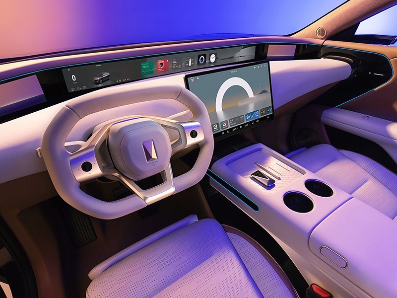 內(nèi)飾方面,車內(nèi)取消大量實體按鈕,配備大尺寸懸浮式中控屏搭配上下平底三輻式方向盤。在上方還有一塊貫穿式窄條幅屏幕以及左右兩塊電子外后視鏡顯示屏。新車還提供手機無線充電、氛圍燈等。