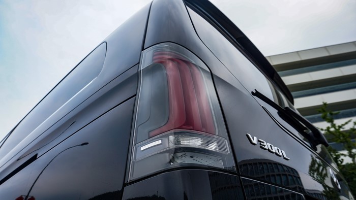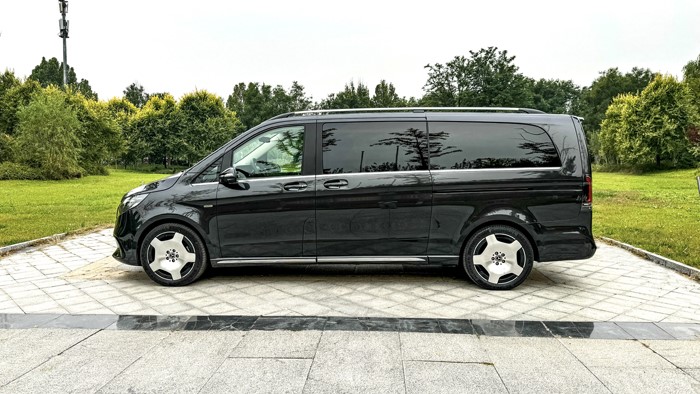 車身側(cè)面:奔馳V300L的車身線條流暢自然,腰線優(yōu)雅流暢,整體視覺效果非常舒展。鍍鉻裝飾條點綴在車窗下沿,凸顯出豪華感。這臺長軸距版本的車身尺寸為:5370*1928*1920mm,軸距3430mm。V級還有標(biāo)準(zhǔn)軸距車型可選擇:5140*1928*1920mm,軸距3200。