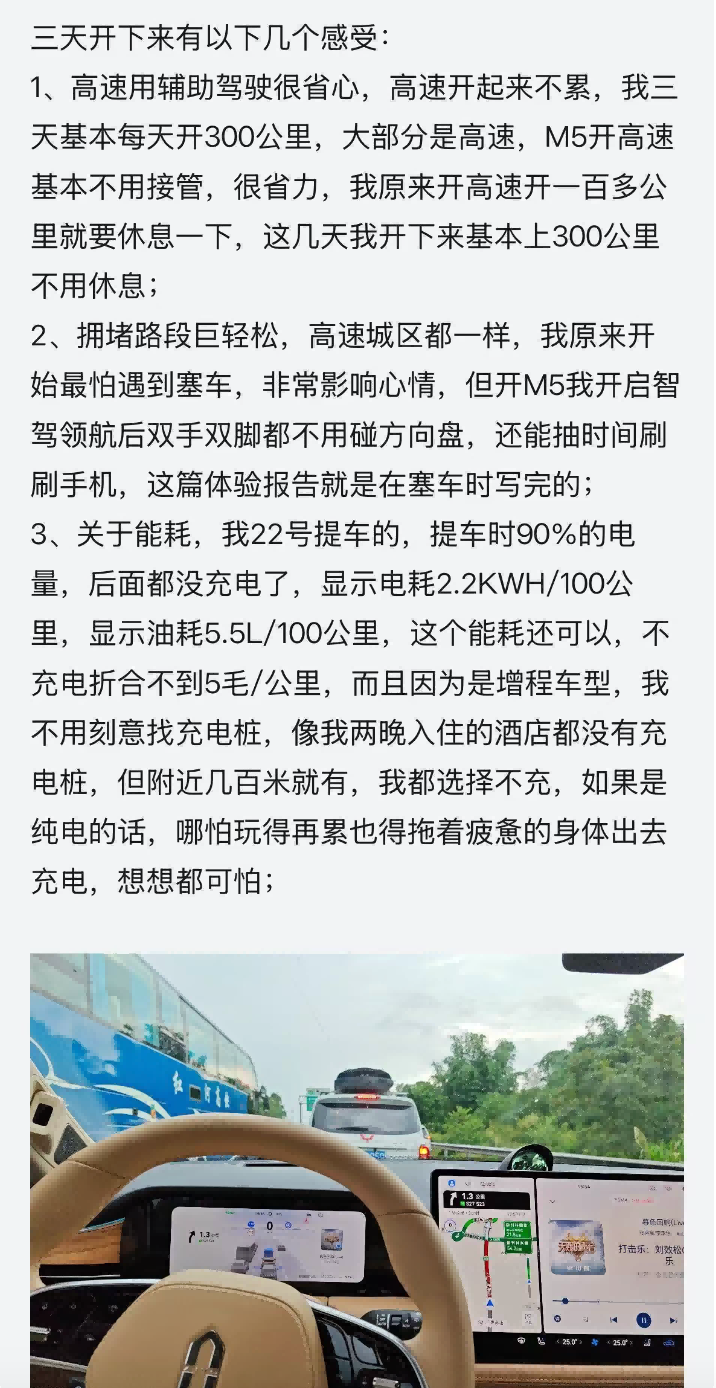 在眾多好評背后,問界新M5憑借的并不僅僅是技術優(yōu)勢,它還在實際使用場景中表現出卓越的產品力,贏得了車主們的廣泛認可。社交媒體平臺上的#問界新M5用車報告#話題中,不少用戶對這款車型的智能駕駛表現和便捷的用車體驗表示了高度認可。微博用戶“一雪”表示:“問界新M5變道很果斷,遇到突然出現的機動車也會及時避讓,通過效率很高?!辈簧儆脩暨€對其智能泊車和舒適的智慧座艙大加贊賞。