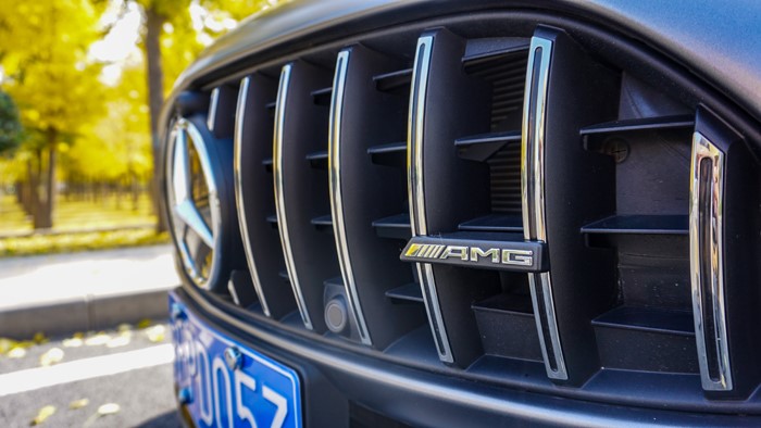 奔馳AMG C43的前臉設(shè)計充滿力量感和動感,前格柵采用AMG專屬的設(shè)計,中央鑲嵌著大尺寸奔馳標志,展現(xiàn)出強烈的品牌認同感。引擎罩上依舊鑲嵌了經(jīng)典的奔馳徽章。