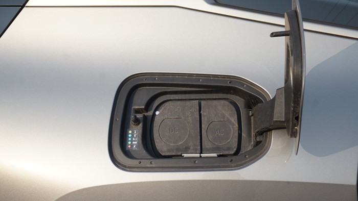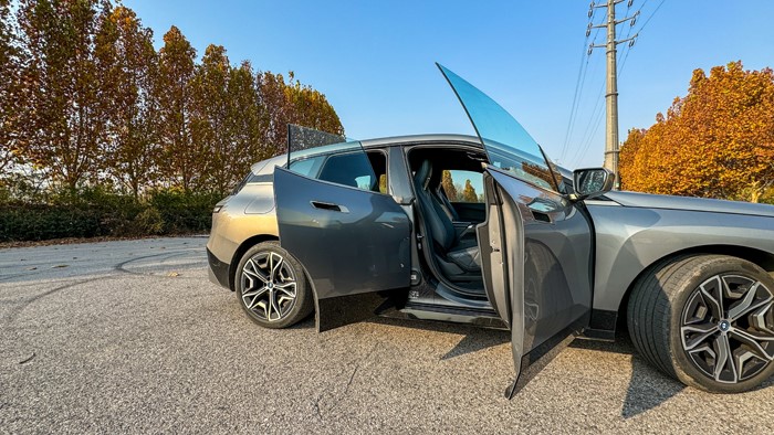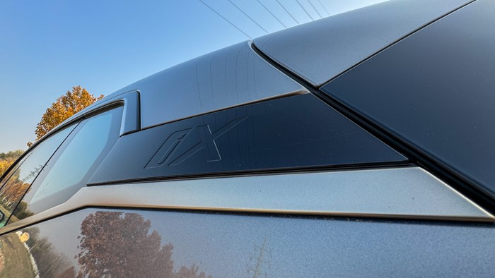 iX全系標(biāo)配21寸輪轂和255/50 R21的輪胎。本試駕車選裝了22寸輪轂,輪胎規(guī)格升級為275/40 R22。四門均為無框玻璃門設(shè)計。右后翼子板設(shè)計了充電接口,車門把手內(nèi)設(shè)計有隱藏式電子開關(guān)。