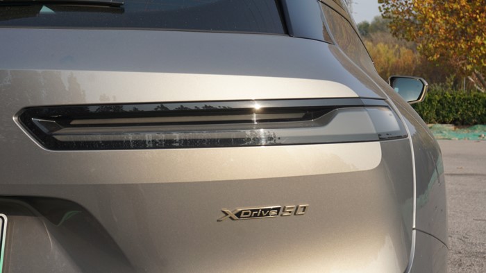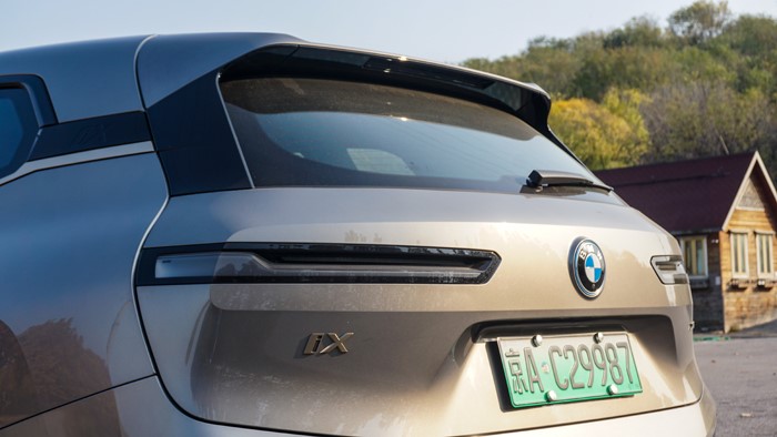 扁平的細(xì)尾燈可以算是iX尾部最個性的設(shè)計,非常前衛(wèi)。仔細(xì)觀察下,尾燈內(nèi)部這條磨砂質(zhì)感的燈帶其實是一個窄窄的“L”型,這也和寶馬家族的其他車型尾燈相呼應(yīng)。
