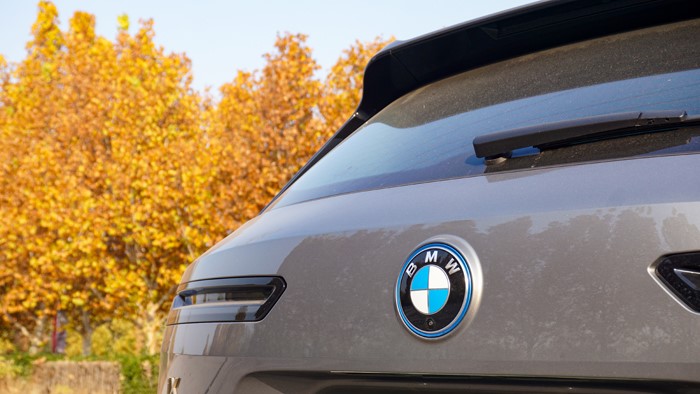 車門玻璃下沿使用泰坦金色裝飾延伸至車尾,黑色iX標(biāo)識鑲嵌在C柱上。整個車身的設(shè)計靈感源于經(jīng)過精細(xì)打磨的巨石,也就是寶馬所稱的“原石切割”。所以可以在車身圓潤中透著很多折角線條。