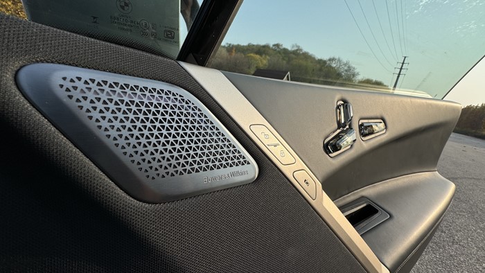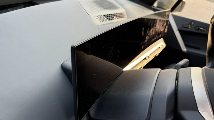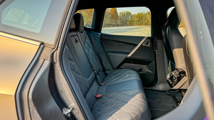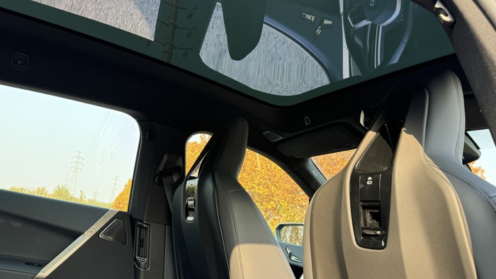 iX有著比寶馬X5更長的車長(4955mm)和軸距(3000m),加之純電平臺帶來的純平地面以及寬大的坐墊,后排乘坐體驗無需擔(dān)憂。后排座椅同樣是軟軟的,兩側(cè)還有打孔菱形設(shè)計的軟質(zhì)材料一直包覆至車門的開口,這更像是一張環(huán)繞式的大沙發(fā)。得益于高強度碳纖維車頂橫梁的應(yīng)用,一體式大玻璃車頂在iX身上成為了可能,這也是目前天窗面積最大的寶馬車型。與其說是全景車窗,這塊大玻璃更適合稱作全景天幕,不能開啟通風(fēng),但能提供極佳的光線和開揚感。此外,這塊大天幕還帶有類似波音787上舷窗的電子控制透光率功能,通過內(nèi)后視鏡后方的觸摸按鍵可以實現(xiàn)分級調(diào)節(jié)透光率,且具有優(yōu)秀隔音隔熱性能。