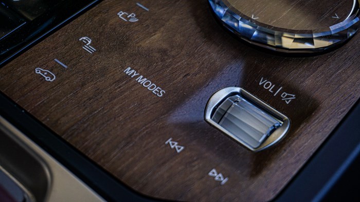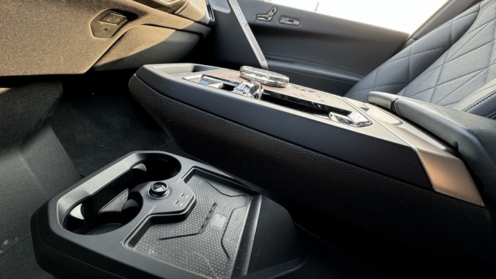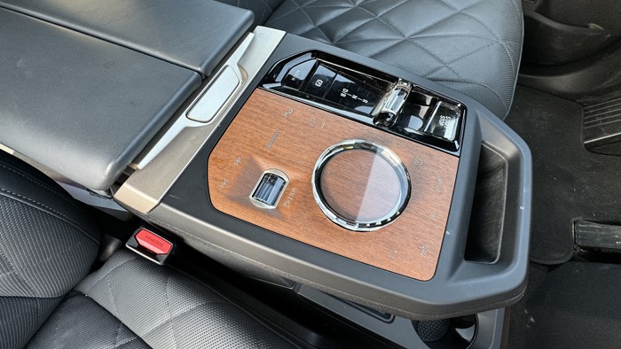iX的前排扶手上集成了電子換擋機構(gòu)以及iDrive的控制界面,多媒體屏幕本身帶有觸摸功能,但寶馬還是執(zhí)著地保留了iDrive的旋鈕和按鍵。充滿清新風(fēng)格的iDrive控制區(qū)采用了實木裝飾,旋鈕采用水晶材質(zhì),木板上的文字按壓操作手感非常好。下方的平臺除2個水杯架外還留有手機無線充電。