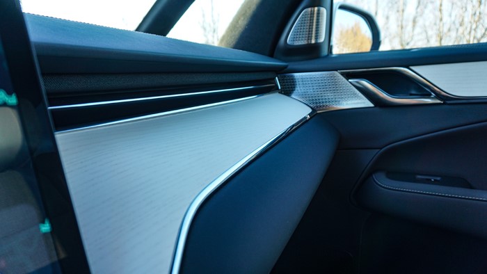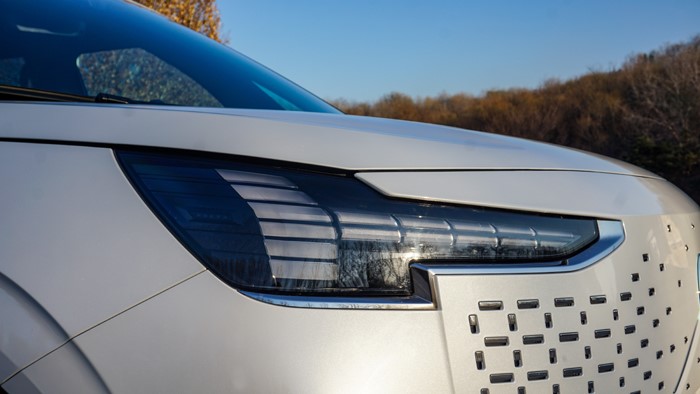 全封閉的前臉上所有裝飾件都可以發(fā)光,并且是有節(jié)奏規(guī)律的點(diǎn)亮,很有儀式感。這些由密到疏的點(diǎn)陣式鍍鉻裝飾很有星際的感覺,離近了觀察,是背部暗藏了發(fā)光光源。前杠下端還鑲嵌了整根鍍鉻裝飾,提升豪華感。