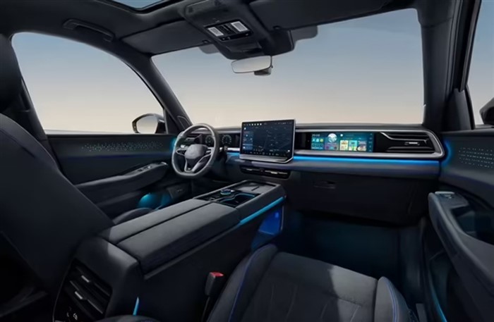 內(nèi)飾方面,新車內(nèi)飾采用大面積的翻毛皮材質(zhì),藍色的縫線裝飾,中控臺銀色裝飾修邊,營造精致豪華氛圍??萍寂c舒適配置方面,車輛采用三屏設(shè)計,儀表盤引入AR實景導(dǎo)航,懸浮式中控屏有著豐富的第三方應(yīng)用,語音控制一次可完成多個指令,手機互聯(lián)支持CarPlay、CarLife、HiCar。副駕屏有影音娛樂功能。