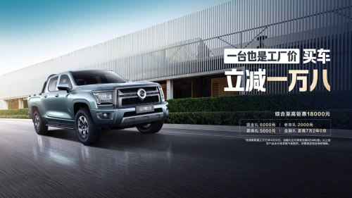 金剛炮8AT不僅有硬核實(shí)力,更有誠(chéng)意滿滿的價(jià)格,售價(jià)9.98萬(wàn)元起,用戶花手動(dòng)擋的錢(qián)就能買(mǎi)到自動(dòng)擋皮卡。同時(shí),金剛炮終端優(yōu)惠力度空前,一臺(tái)也是工廠價(jià),買(mǎi)車(chē)立減一萬(wàn)八,性價(jià)比直接拉滿。即日起至4月30日,購(gòu)買(mǎi)金剛炮限時(shí)綜合鉅惠至高18000元,可享6000元現(xiàn)金禮、2000元老友禮、5000元置換禮,以及至高7萬(wàn)2年0息等諸多禮遇……福利多多,相比同級(jí)車(chē)型簡(jiǎn)直不要太劃算。