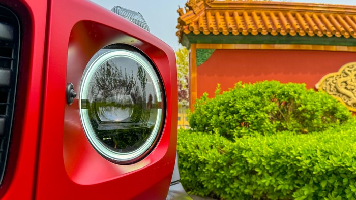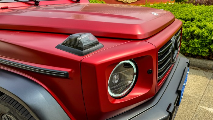帶有暗夜套件的中網(wǎng)及前黑色保險(xiǎn)杠形成了雙拼配色,非常明顯。從這一代奔馳G開(kāi)始,奔馳G一直以來(lái)所堅(jiān)持的“方正”造型演繹出了細(xì)微的變化,前保險(xiǎn)杠不再是一條直線,兩側(cè)變得略微后掠。