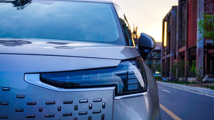 沃爾沃EM90全封閉的前臉上所有裝飾件都可以發(fā)光,當(dāng)你走近車輛,這些光源會有節(jié)奏規(guī)律的點(diǎn)亮,很有儀式感。這些由密到疏的點(diǎn)陣式鍍鉻裝飾很有星際的感覺,離近了觀察,是背部暗藏了發(fā)光光源。前杠下端還鑲嵌了整根鍍鉻裝飾,提升豪華感。