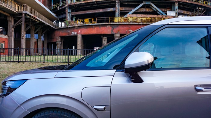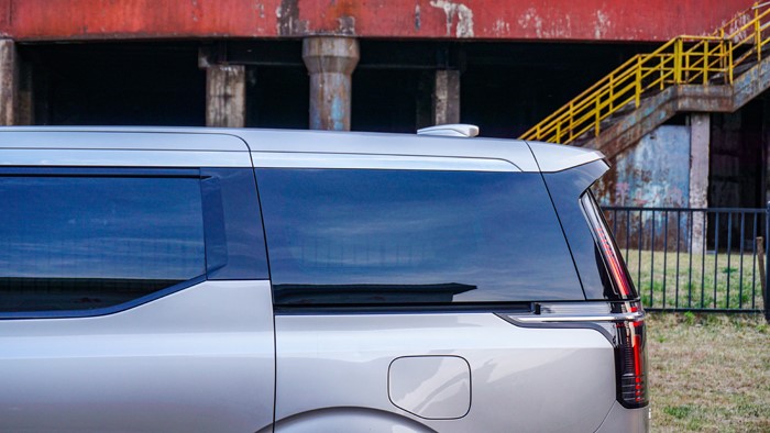 車身側(cè)面線條簡潔利落,流暢的車頂線條與傾斜的后車窗相得益彰,營造出動感的視覺效果。在三圍方面:5206×2024×1859mm,軸距3205mm。該車選配了21寸的大型雙色輪轂,采用馬牌輪胎,靜音效果不錯。