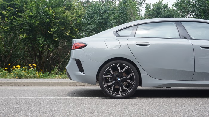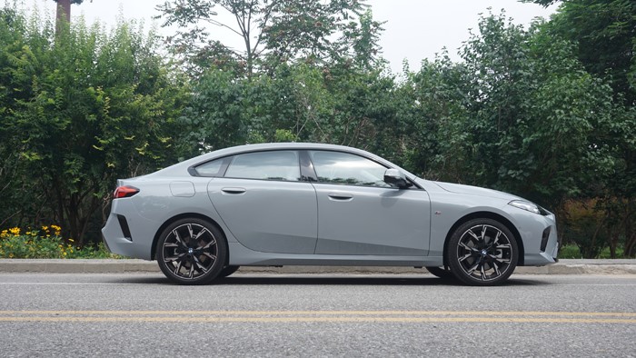車身側(cè)面可以看出是一臺(tái)轎跑車的姿態(tài),很明顯的溜背短尾造型設(shè)計(jì)。國(guó)產(chǎn)寶馬2系的車身尺寸為4663*1801*1457mm,相比進(jìn)口版車型長(zhǎng)度有所增長(zhǎng),軸距達(dá)到了2780毫米。該車輪胎規(guī)格為225/40 R19,雙拼色M運(yùn)動(dòng)輪轂造型還是十分動(dòng)感的。