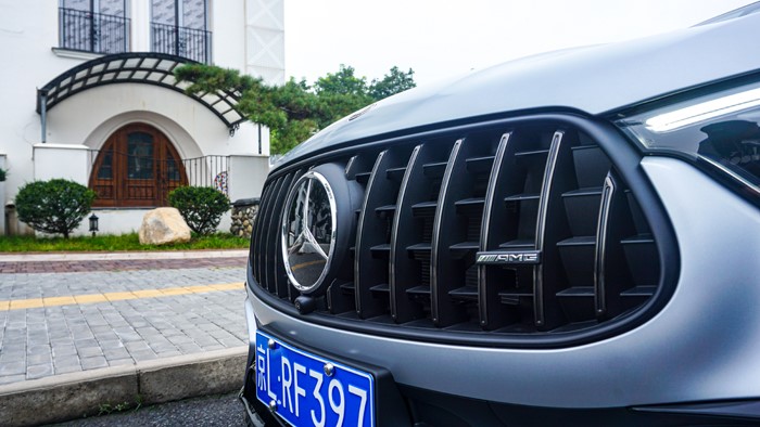 前臉采用了AMG直瀑式進氣格柵和熏黑的LED大燈組合,展現出強烈的力量感。引擎罩上鑲嵌了AMG的徽章,很有辨識度。
